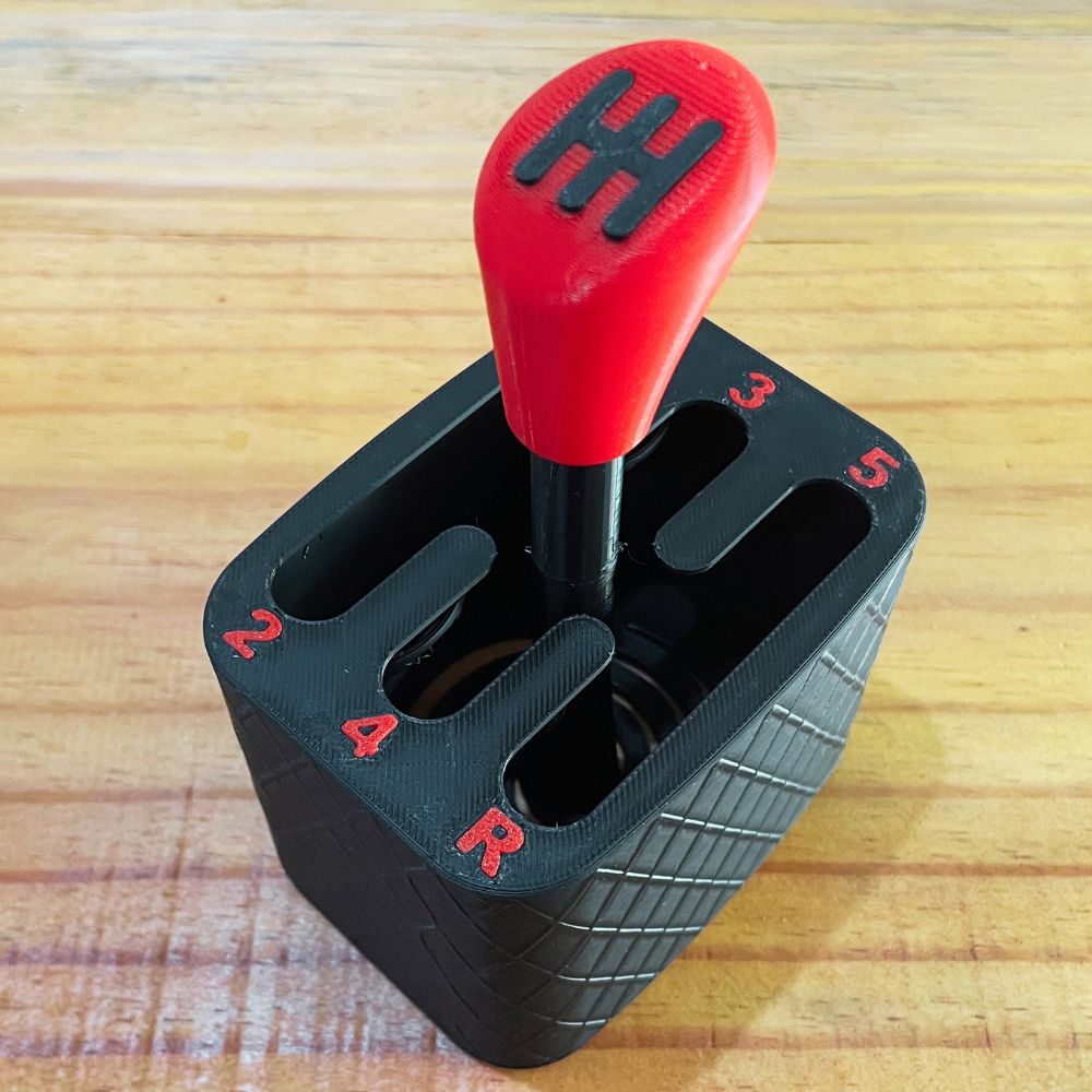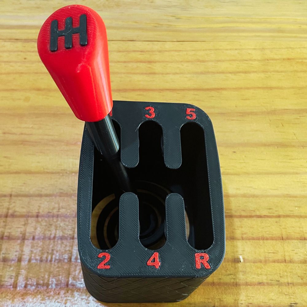 Produzida em impressão 3D com plástico PLA, a peça é leve, resistente e possui acabamento detalhado, com destaque para a manopla vermelha e a marcação das marchas (1, 2, 3, 4, 5 e R). Seu design compacto é ideal para uso em casa, no consultório ou em ambientes educativos.